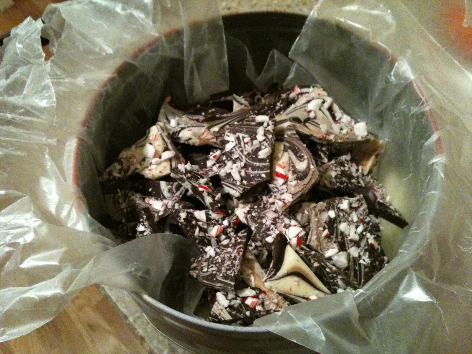 Peppermint bark–semi-sweet chocolate swirled with white chocolate, with crushed candy canes on top. YUM! |